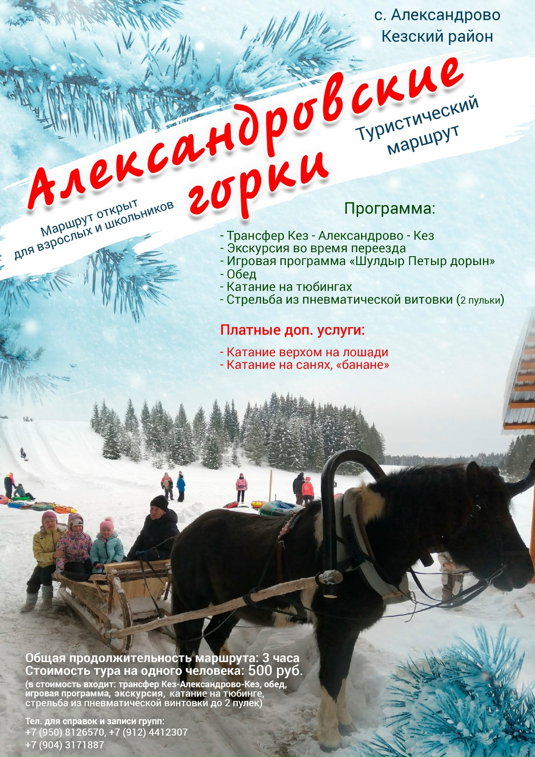 Программа: - - - Трансфер Кез - Александрово - Кез Экскурсия во время переезда Игровая программа «Шулдыр Петыр дорын» - Обед - Катание на тюбингах - Стрельба из пневматической винтовки (2 пульки)