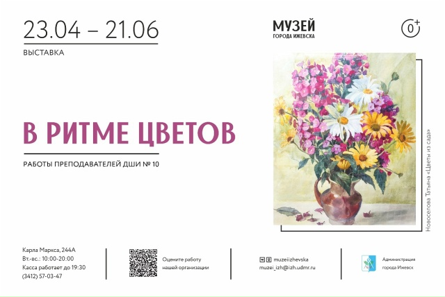«В ритме цветов». В экспозицию вошли 17 работ семи преподавателей. Картины объединены цветочной тематикой и выполнены в технике акварельной, гуашевой живописи и пастели.