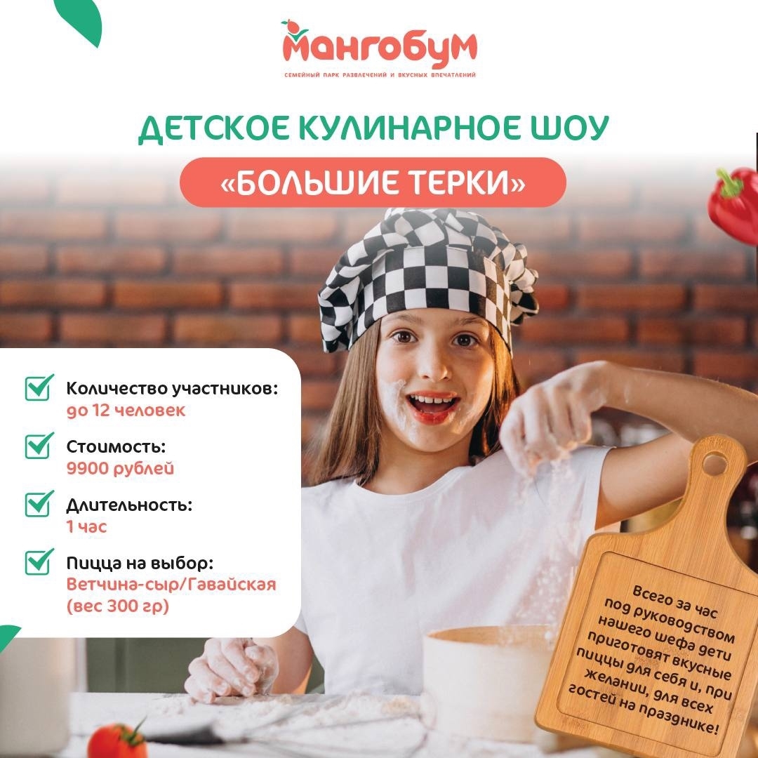 Приглашаем ваших юных поварят на наше кулинарное шоу «Большие тёрки» — мастер-класс по приготовлению настоящей пиццы вместе с шеф-поваром ресторана Мангобум!