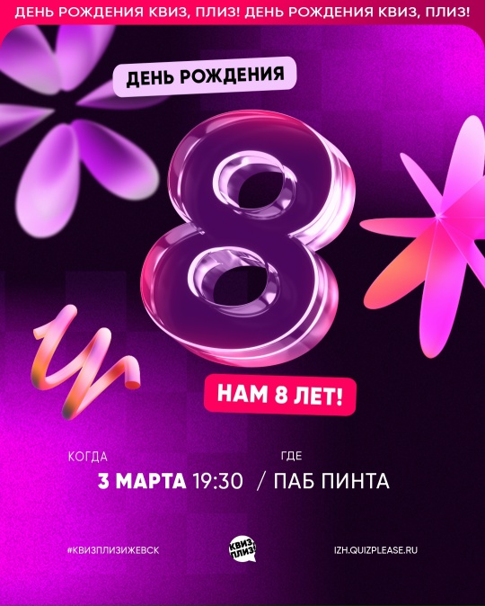 Квиз, плиз! [Happy Birthday] IZH #1 — актуальное мероприятие в Ижевске. Узнайте подробности о месте, времени проведения и билетах, чтобы выбрать удобную дату для посещения.