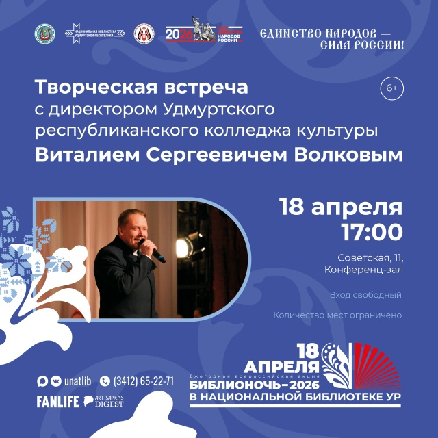 Творческая встреча с Виталием Волковым в рамках Библионочи – 2026Национальная библиотека УР приглашает на творческую встречу с Виталием Сергеевичем Волковым – директором Удмуртского республиканского колледжа культуры, дипломантом международного фестиваля «Славянский базар», лауреатом всероссийских конкурсов, выпускником колледжа и Пермского государственного института культуры.