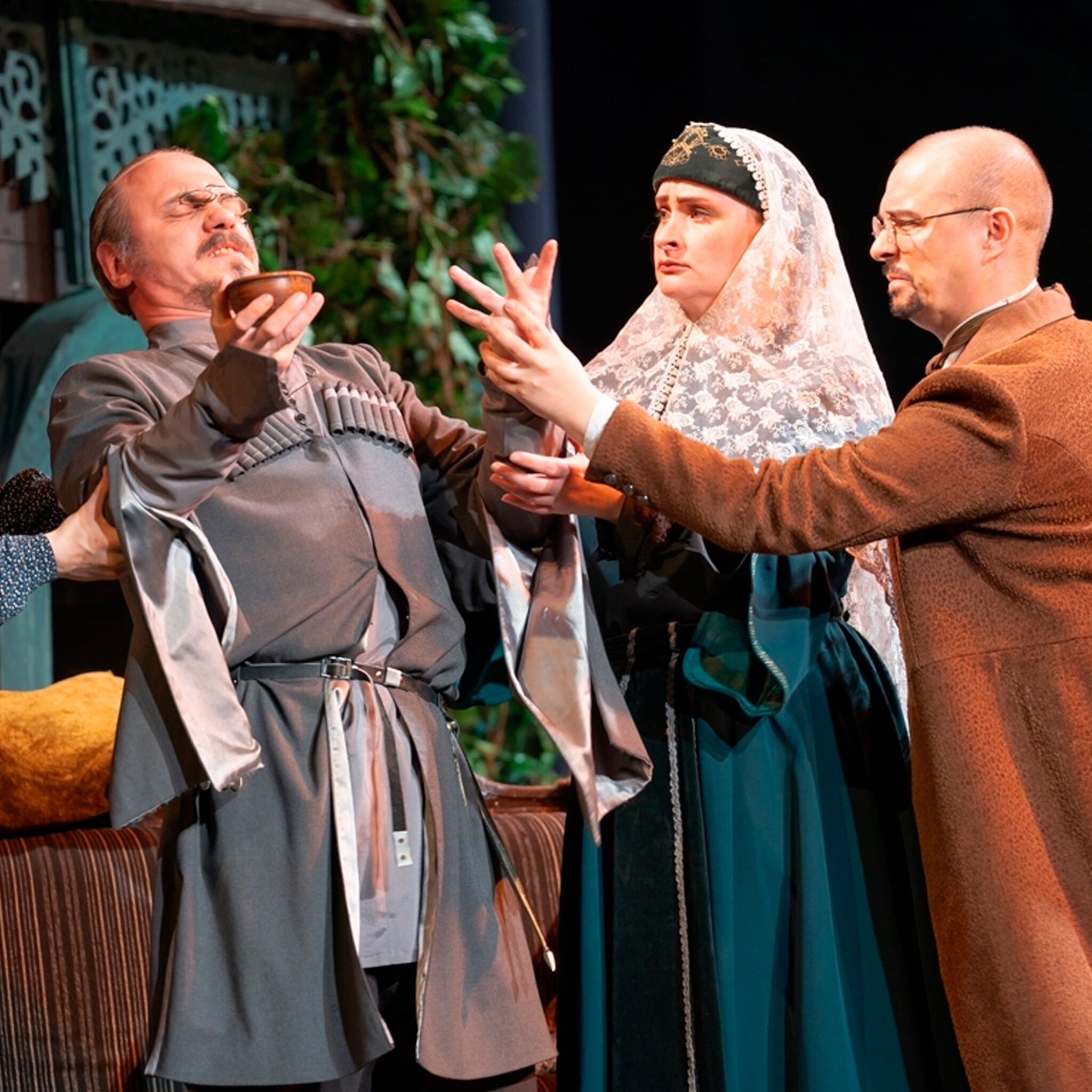 Грузинский колорит этого феерического спектакля звучит в тостах, песнях, юморе, многословии и велеречивом восхвалении женской красоты, в горячих темпераментных героях. Вы окажетесь в старом Тифлисе, почувствуете свежее дыхание гор, услышите шум реки Куры, увидите колоритные домики XIX века с резными балкончиками и садами.