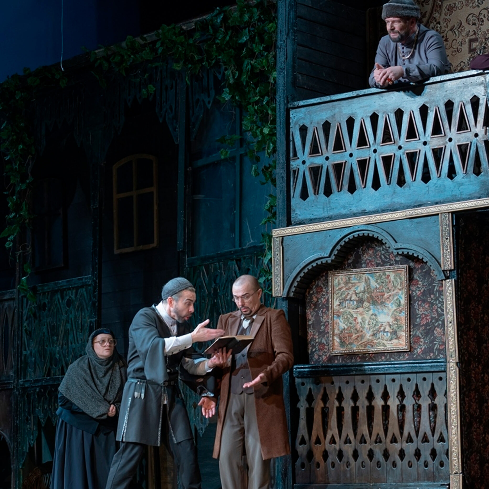 Этот старинный уютный городок населяют весёлые и простодушные люди, живущие сочно, ярко и открыто, уважающие друг друга и всегда отстаивающие свою честь. Оформление сцены, выдержанное в зелёном, коричневом и чёрных тонах, напоминает картины раннего Нико Пиросмани, самого знаменитого живописца Грузии.