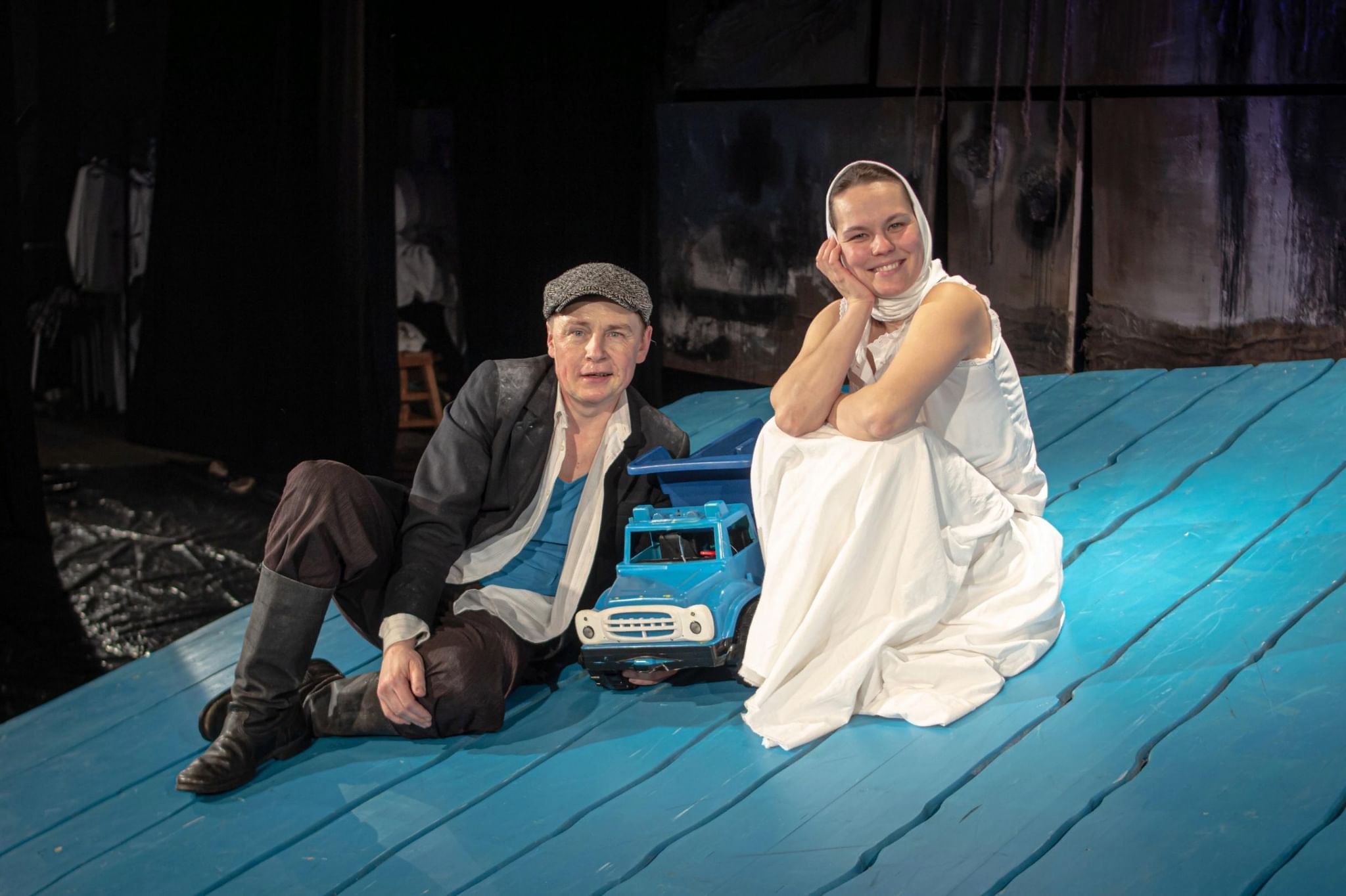 В спектакле не два, а три действующих лица, т.к. постоянно в действие «врывается» машина, о которой всё время думает, к которой то и дело «выбегает» Михайло и к которой ревнует его Анна. Кроме того, есть едва упомянутые, но при этом яркие «внесценические» персонажи: Василиса, которая «ходит, вихляясь без меры»; завмаг Ганя, попавший под ревизию и суд; его жена Зоя, которая «в день по два раза переодевалась, не знала какое платье надеть». Эти-то «внесценические» персонажи и создают тот контрастный темный фон, на котором только и можно по достоинству оценить «светлые души» главных героев.